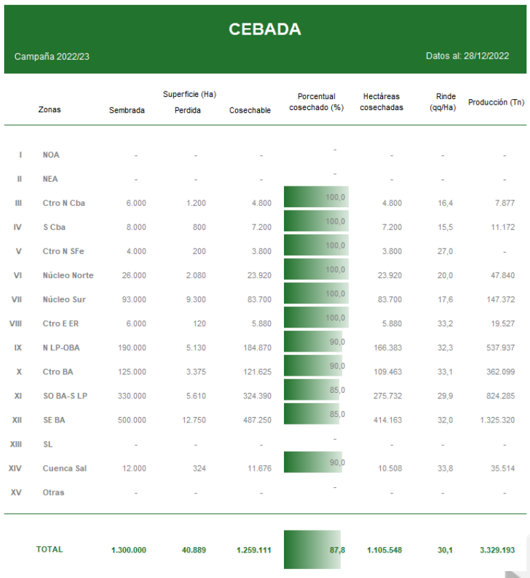 El clima seco durante las últimas semanas permitió dar por finalizada las labores de cosecha sobre sobre amplios sectores del centro del área agrícola. La ausencia de lluvias durante gran parte de la campaña junto a las heladas tardías registradas durante el mes de octubre, mientras el cultivo se encontraba definiendo rendimientos, generó importantes mermas de rendimientos con respecto al promedio de las últimas cinco campañas