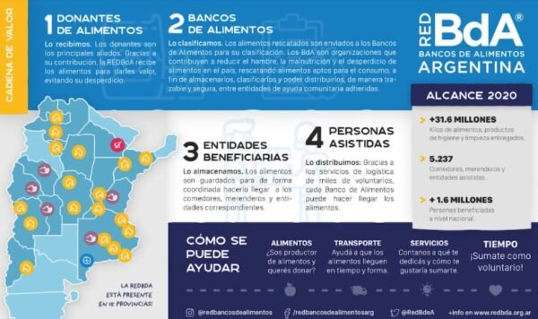 Entre 2003 y 2019 la REDBdA distribuyó más de 111.334.289 kilos de alimentos que se traducen en más de 334 millones de platos de comida. En 2019, más del 75% de los beneficiarios fueron niños y adolescentes menores de 18 años. Para contribuir con la REDBdA se puede hacer a través del aporte de alimentos, la contribución económica, la prestación servicios o tiempo como voluntario y el suministro de transporte. Para más información ingresar a: https://www.redbda.org.ar/ayudar