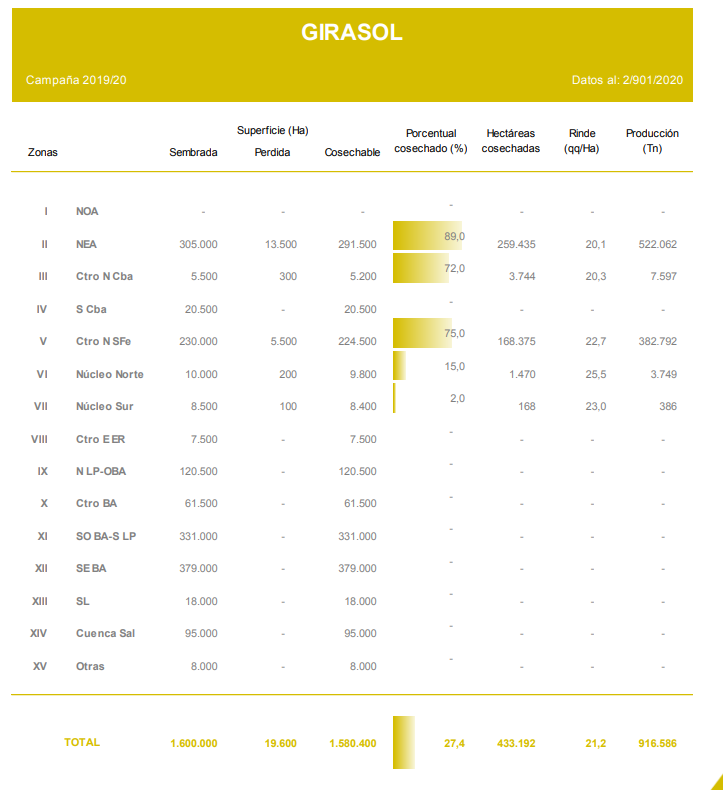 La cosecha cubrió el 27,4 % del área apta, aún concentrando su mayor actividad en los núcleos girasoleros del NEA y Centro-Norte de Santa Fe. En paralelo, comenzaron a moverse las maquinas sobre cuadros implantados en el Centro-Norte de Córdoba y en las regiones Núcleo Norte y Sur. Durante los últimos siete días, se recolectaron 65 mil hectáreas y el rinde promedio nacional se mantuvo estable en torno a los 21,2 qq/Ha. Bajo este escenario, la proyección de producción permanece en 3,2 MTn.