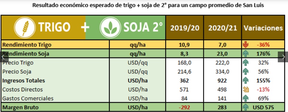 Para el caso del planteo combinado, el rendimiento promedio de trigo de la campaña actual para San Luis fue un 36% menor al de la campaña previa, alcanzando los 7 quintales por hectárea debido a las adversidades climáticas. Sin embargo, el buen desempeño de la oleaginosa y el mejor precio para ambos cultivos permitiría recuperar las pérdidas en la productividad del trigo.