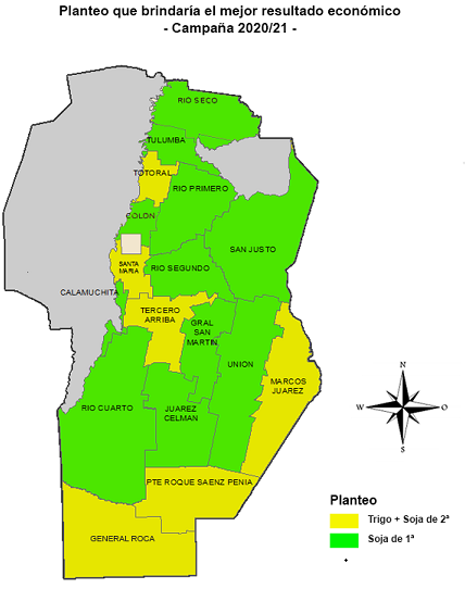 La provincia de Córdoba presenta una amplia variabilidad en lo que respecta a calidad de suelos, distancia al principal puerto de exportación y condiciones agrometeorológicas, por lo que la rentabilidad difiere entre zonas. Para la campaña 2020/21 se esperan resultados económicos para soja de primera entre USD -17 y USD 230 por hectárea. Los departamentos que presentarían los mejores resultados serían San Justo (USD 230,3/tn) y Unión (USD 183,2/ha). Los departamentos del este de la provincia se benefician de suelos más fértiles y una menor distancia al puerto de Rosario, lo que se traduce en menores costos por flete, mientras que los departamentos del norte y el oeste de la provincia presentan menores costos en el alquiler de la tierra. Por otro lado, los menores resultados se esperan en Santa María (USD –17,2/ha) y Totoral (USD 3,6/ha), derivados principalmente de un rendimiento de soja que se estima en un promedio de 24,7 qq/ha y 24,6 qq/ha respectivamente.
