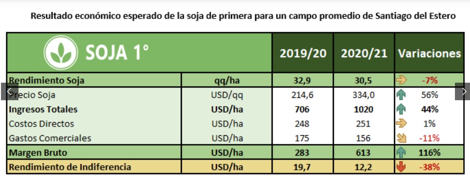 Para la provincia de Santiago del Estero, se espera un rendimiento promedio de soja de primera de 30,5 quintales por hectárea, lo que representa una disminución de 2,4 qq/ha respecto a la campaña previa. Si bien esta productividad es más baja que la del año anterior por un 7%, el precio de la oleaginosa incrementaría en un 44% que, junto a menores costos comerciales, llevarían a un margen bruto de USD 613/ ha, 116% mayor al de la campaña previa.