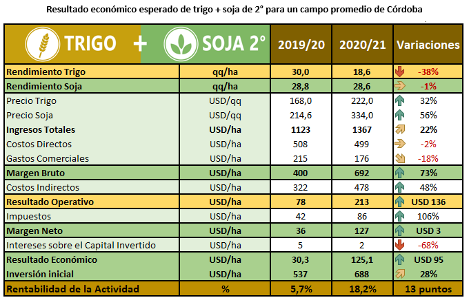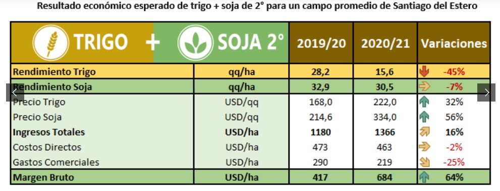 Con respecto al planteo combinado de trigo y soja de segunda, los resultados se muestran no sólo más optimistas que hace unos meses, sino que se espera una mayor rentabilidad que para la campaña previa a pesar del golpe sufrido por el trigo. El rendimiento del cereal durante la campaña 2020/21 se ubicó en 18,6 quintales por hectárea, 11,4 quintales menos que el ciclo previo. Si bien el precio del cereal se incrementó en USD 54 la tonelada, esto no alcanzó a compensar la menor productividad, y el efecto neto en los ingresos totales del trigo se redujeron en USD 92/ha. De no haber sido por el aumento en el precio, esta reducción se hubiese incrementado hasta los USD 192/ha.