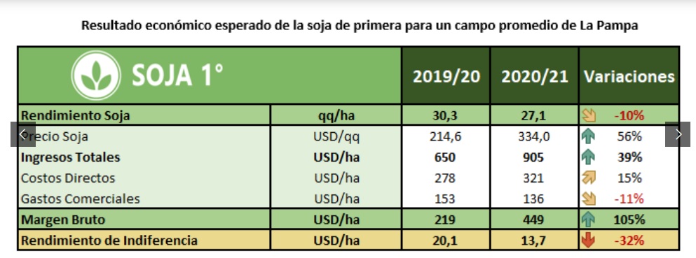 Para la provincia de La Pampa se esperan rendimientos de soja inferiores a los del ciclo previo por 3,2 quintales por hectárea, ubicando el promedio provincial en 27,1 qq/ha en la campaña 2020/21. Esta caída representa una merma del 10% en la productividad, que logra más que compensarse por los precios elevados de la oleaginosa.