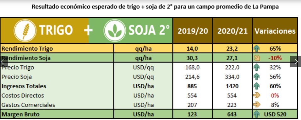 El trigo incrementó su rendimiento en la campaña 2020/21, alcanzando los 23,2 quintales por hectárea, un 65% mayor al del ciclo anterior. A pesar de que el rendimiento de la soja disminuiría en un 10%, el precio sería un 56% más elevado, permitiendo estimar un ingreso total mayor.