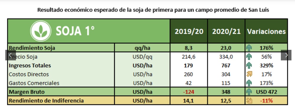 La provincia de San Luis presentaría una recuperación en el rendimiento de la oleaginosa, pasando de 8,3 quintales por hectárea en la campaña 2019/20 a un promedio de 23 qq/ha en la campaña actual. Siendo este rendimiento casi tres veces superior al del ciclo anterior, sumado a mejores precios, es de esperar un incremento en el margen bruto cercano a los USD 472/ha, alcanzando el valor de USD 348/ha en la campaña 2020/21. La mayor producción esperada se traduce también en mayores costos de cosecha, reflejado en el incremento de los costos directos en un 17%, y en gastos de transporte más elevados, incrementando los gastos comerciales en USD 73/ha.