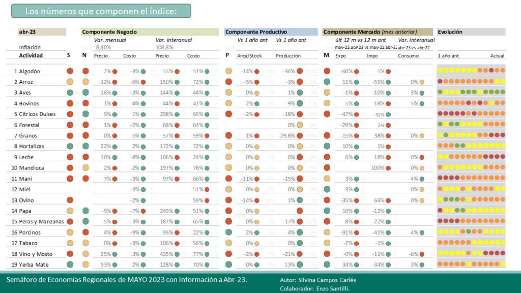 Coninagro publica esta herramienta para que el productor agropecuario pueda hacer un seguimiento de los indicadores que se analizan. Se presenta en detalle el relevamiento de las 19 economías regionales monitoreadas por el área de Economía de CONINAGRO, con cifras que surgen del análisis realizado durante el mes de abril de 2023. El “Semáforo de Economías Regionales” busca simplificar la complejidad y heterogeneidad de la producción en el campo hacia una herramienta visual de análisis.