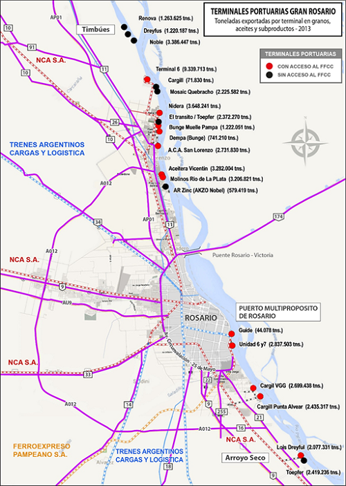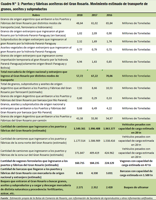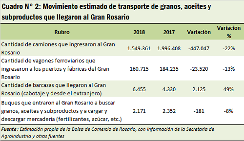 Las estimaciones referidas al movimiento de granos, aceites y subproductos que llegaron en el año 2018 a las terminales portuarias y fábricas del Gran Rosario, ya sea para ser industrializados y/o exportados, muestran que habrían ingresado al Gran Rosario aproximadamente 1.550.000 camiones, 160.700 vagones ferroviarios y 6.450 barcazas. A este enorme movimiento de transporte debe sumarse la entrada de cerca de 2.170 buques que ingresan al Gran Rosario a buscar granos, aceites y subproductos y a cargar y descargar mercadería de distinta naturaleza y procedencia: fertilizantes, contenedores, minerales etc.