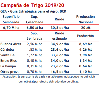 Para el trigo se han efectuado ajustes en la superficie implantada respecto de la estimación anterior. La provincia de Buenos Aires, por falta de agua resignó la siembra de 170 mil ha. De esta forma, con 6,70 millones de hectáreas, el cultivo de trigo consolida un aumento interanual del área del 3,7%. En esta primera estimación nacional de trigo hecha sobre la condición del cultivo se considera un área cosechable de 6,50 M ha y un rinde nacional de 30,8 qq/ha. De esta forma se estiman 20 M de Tn de trigo para el presente ciclo productivo de Argentina.