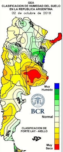 El extenso período seco que abarcó el trimestre frío y sigue extendiéndose sobre octubre le ha quitado al trigo las posibilidades de alcanzar los 21,5 M de Tn de que se proyectaban. Setiembre y los primeros 9 días de octubre mantienen el patrón seco que domina en gran parte del oeste y centro sur de la región pampeana. Ya se estiman casi 2 quintales menos de los 32,5 quintales que se proyectaban. Tambien afectó el nivel sembrado, ajustando el área de la siembra récord a 6,70 M ha, unas 170 mil ha menos que lo estimado hace un mes. Las pérdidas de lotes que empiezan a dejarse de lado por la falta de agua y el efecto de las bajas temperaturas, en forma total o parcial, ya suman 208 mil ha. El resultado de todo esto ajusta la estimación de trigo de Argentina a 20,0 Mt para el ciclo 2019/20.