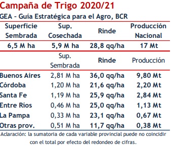 El clima ha privilegiado en este año solo a la provincia de Buenos Aires; comenzó con excelentes condiciones y las lluvias mes a mes han afianzado un escenario de alta productividad en gran parte de su territorio. Si no hay mayores inconvenientes, obtendría un rinde de 36 qq/ha. En el resto del país, los distintos grados de afección por bajas temperaturas y falta de agua se profundizan con un 30 a 50% de perdida de rinde. En Córdoba el trigo pasa por un escenario de desastre productivo: se estima, como media provincial, un rinde menor a los 22 quintales y casi 200 mil ha pérdidas. Córdoba este año quedaría muy lejos de acercarse a los casi 31 qq/ha que tuvo como promedio en los últimos 5 años. El área santafesina también recibirá un durísimo golpe productivo; apenas se alzaría con una marca provincial 25,9 qq/ha, o sea 10 quintales menos que el año pasado. Y en el norte del país, la incógnita que deja el cultivo es ¿qué tan malo será el rinde final y qué logrará cosecharse? En Chaco los resultados van de los 2 a los 8 quintales, y en los mejores lotes se esperan solo 12 qq/ha. Por ahora, en la provincia se estima un rinde de 8 qq/ha y la pérdida de la mitad de los lotes sembrados. En Santiago del Estero las estimaciones son un poco más optimistas: 13 qq/ha de promedio y un 35% de lo sembrado perdido.