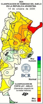 La intención de siembra de soja 2020/2021 por ahora no muestra cambios respecto a un mes atrás. La soja podría producir 50 Mt de soja. Pero para comenzar a sembrar en los próximos días se necesitan más de 30 mm en la franja central del país. Las expectativas de lluvias están puestas en la próxima semana, entre el lunes y el martes próximos. La campaña de soja comienza con un déficit hídrico muy severo en los suelos exceptuando la provincia de Buenos Aires. “La segunda quincena de octubre puede contar con desarrollos que logren desactivar el bloqueo que domina la franja central del país desde hace meses. De todos modos, es poco probable que se satisfagan los altos niveles de agua que requieren las provincias de Córdoba y Santa Fe, y mucho menos el norte argentino”, comenta el Dr. en Cs. Atmosférica Aiello.