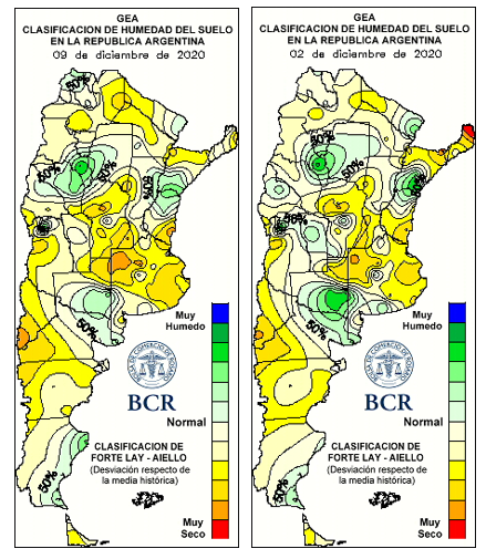La sequía sigue marcando el ritmo de la siembra. Lo hizo con el maíz temprano, luego con la soja de primera y ahora con la de segunda. Pero a los 10 días de diciembre, el reloj corre más rápido, la demanda atmosférica es mucho mayor: a esta altura del año, con más de 10 horas de insolación diarias, se pierden entre 3 a 5 mm por día. Y tras las lluvias de la semana pasada, se aceleró todo. La actividad fue febril en la región: en los últimos siete días se sembraron 100.000 ha que estaban pendientes con soja de primera, 975.000 ha con soja de segunda y se cosecharon 300.000 ha con trigo. El avance de siembra de la soja de segunda es del 65% y fue logrado en una semana. Por la falta de agua ya se dejó de sembrar en áreas del centro del oeste cordobés, como en Marcos Juárez, que alcanzó a sembrar el 75%, o en General Pinto en el oeste de Buenos Aires, o Villa Cañas o María Teresa en el sur de Santa Fe dónde se sembró el 50%. También hay algunas zonas cercanas a Clason con encharcamientos que han quedado pendientes por falta de piso.