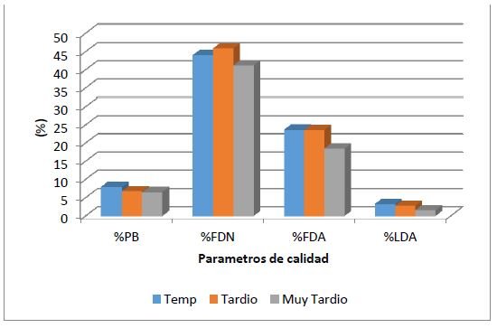 En cuanto a la calidad de la planta (ver gráfico), cuando se la compara con los maíces tempranos o los tardíos, presenta valores similares o un poco mejores especialmente en el % de FDN, FDA y LDA.
