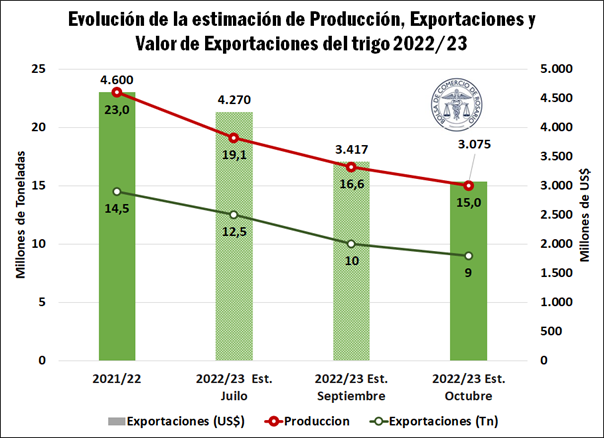 Con este panorama productivo, la previsión de exportaciones del nuevo ciclo se revisa a la baja a 9 millones de toneladas, 5,5 millones por debajo de los despachos de la campaña previa. Además, si comparamos el valor de las exportaciones proyectadas, el ingreso de dólares proyectado por embarques de trigo 2022/23 caería un 35% en relación con el ciclo 2021/22, nada menos que US$ 1.525 millones.