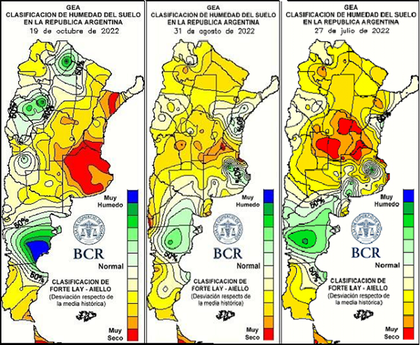 Según datos del último informe mensual de estimación de cultivos de SAGyP, las zonas más perjudicadas por la sequía son el centro norte de Buenos Aires, sur de Santa Fe, Córdoba, Chaco, Santiago del Estero, San Luis y la región del NOA. El crecimiento del trigo en estas zonas es escaso y muchos lotes directamente se han perdido. No obstante, en el resto de las zonas productivas, la situación es entre buena y regular, y con una fuerte dependencia de lluvias futuras para que la floración del cereal no se vea tan afectada. Actualmente el desarrollo de los lotes de trigo que siguen en carrera está abarca un 36% en estado de encañazón, 25% en floración, 30% en llenado de granos y 9% en estado de madurez; en tanto que la condición es muy bueno en el 1% del territorio, 51% bueno, 38% regular, 8% malo y un 2% muy malo.