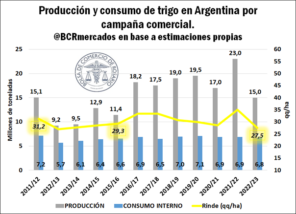 La hoja de balance del trigo de la nueva campaña queda configurada de la siguiente manera: con un rinde promedio de 27,2 qq/ha, el área sembrada quedó definida en 5,9 M ha, cosechándose -según estimaciones hasta el presente- 5,5 M ha. Esto deja un saldo de casi 400.000 hectáreas sin cosechar por los efectos devastadores de la sequía. Incluso si la situación productiva deja de deteriorarse (lo que requiere la inminente ocurrencia de lluvias generalizadas, especialmente sobre el centro sur de Buenos Aires y La Pampa) lo anterior determina un nivel de producción de alrededor de 15 Mt.