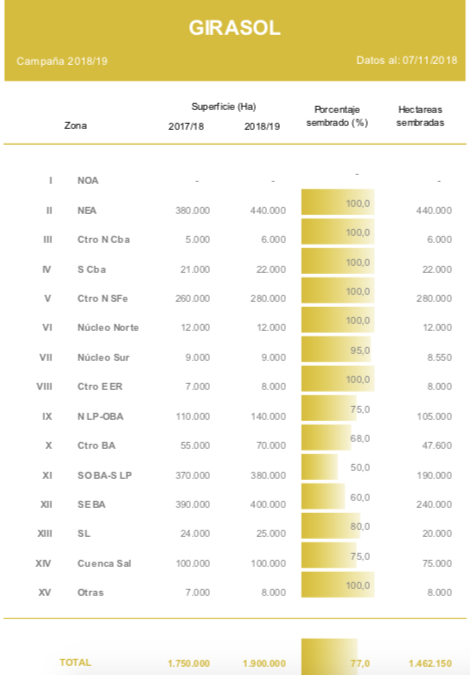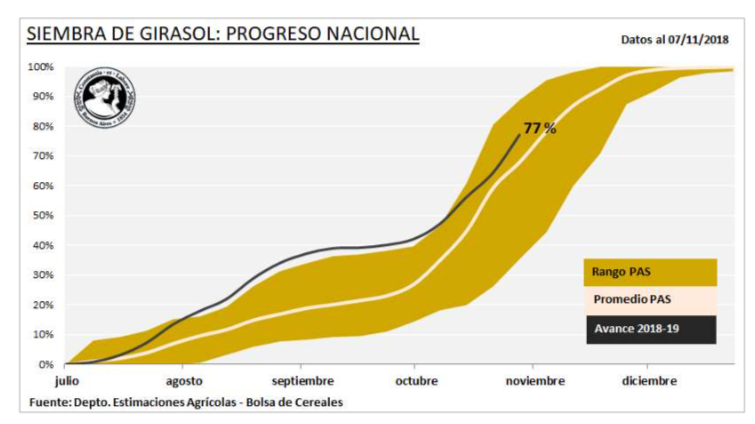 Las buenas condiciones climáticas permitieron avanzar con la siembra de girasol sobre las regiones del centro y sur del área agrícola nacional. A la fecha, el 77 % de las 1.900.000 hectáreas proyectadas para la campaña en curso ya se encuentran implantadas, manteniendo un adelanto interanual de 8 puntos porcentuales. Los mayores progresos se relevaron sobre el centro y sur de Buenos Aires, mientras que en el Sur de Córdoba las labores concluyeron luego de incorporarse los últimos lotes tardíos.