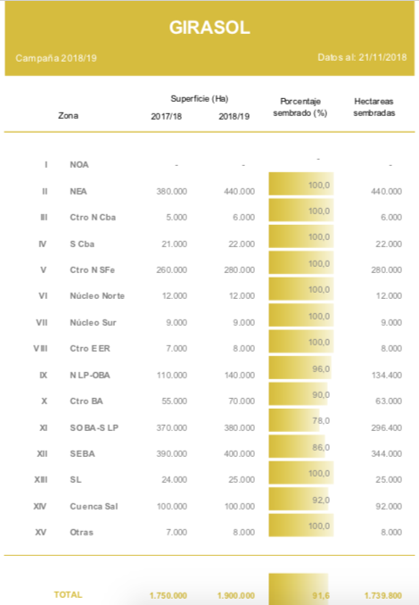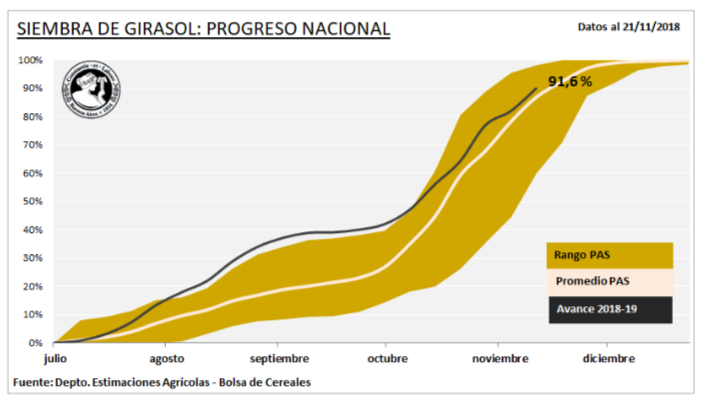 Luego de una semana con gran actividad de siembra en las provincias de Buenos Aires y La Pampa, las labores de implantación de girasol comenzaron a transitar su tramo final. El progreso nacional de siembra alcanzó el 91,6 % de las 1.900.000 hectáreas proyectadas para el presente ciclo, manteniendo un adelanto interanual de 1,5 puntos porcentuales. Los lotes más avanzados en su desarrollo transitan las últimas etapas de llenado de grano sobre el norte del país, mientras que en las regiones del sur del área agrícola aún se desarrollan etapas vegetativas.