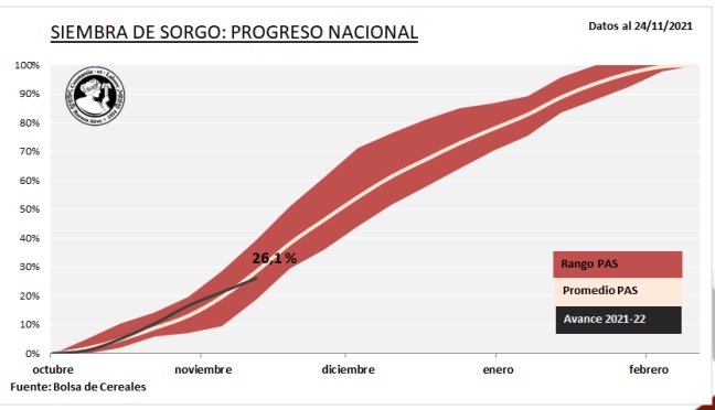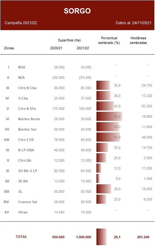 Desde nuestro informe previo, la siembra de lotes de sorgo granífero continuó en gran parte del área agrícola nacional. El aumento de la temperatura permitió que las labores se aceleren en las provincias de Córdoba, San Luis, Buenos Aires, La Pampa, Santa Fe y Entre Ríos. A la fecha el avance de siembra se ubica en 26,1 % de un área estimada en 1.000.000 Ha para la campaña 2021/22, un 5,3 % superior al ciclo previo (Superficie campaña 2020/21: 950.000 Ha.). A la fecha la siembra registra una demora interanual de 5,8 puntos porcentuales, luego de relevarse un avance interquincenal de las labores de 9,5 pp.