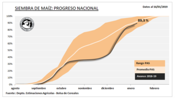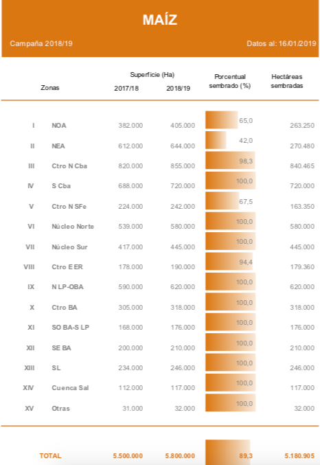 Los mayores avances se dieron en las provincias de Buenos Aires, Córdoba y La Pampa, con la incorporación de los últimos lotes tardíos. El avance a la fecha se ubica en el 89,3 %, con 5,2 MHa incorporadas a lo largo del país. Frente a este panorama mantenemos la proyección de siembra de maíz con destino grano comercial para la campaña 2018/19 en 5.800.000 Ha.
