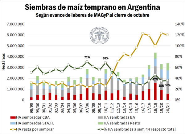 Las labores de siembra de maíz 2020/21 han trascurrido su segundo mes alcanzando un avance sobre la superficie estimada del 36% a nivel país, de acuerdo a datos del Ministerio de Agricultura, Ganadería y Pesca (MAGyP). Es importante recalcar que las condiciones edafo-climáticas han generado cierta incertidumbre respecto a la intención de siembra del cultivo, debido a la ausencia de lluvias en amplias regiones productivas. De esta forma, se ha visto limitada la implantación del maíz temprano en zonas claves del sur y oeste de Córdoba, Santiago del Estero, Chaco y norte de Santa Fe.