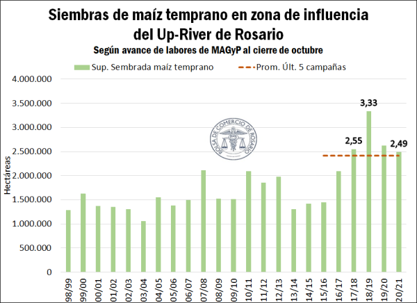 Si se contempla el área que va del norte de Buenos Aires hasta el norte argentino, abarcando así toda aquella región donde el maíz destinado a exportación encuentra como puerto de salida las terminales del Gran Rosario (y que, por tanto, se ha denominado zona de influencia del Up-River), se obtiene una superficie implantada de maíz temprano de 2,49 M ha. Dicho guarismo es un mínimo desde el ciclo 2016/17 pero no dista demasiado de las 2,6 M ha sembradas el año previo. De esta forma, puede proyectarse que el volumen del cereal en condiciones de descargarse en marzo/abril en las terminales ubicadas entre Timbúes y Arroyo Seco sería en principio similar al del año anterior, aunque ello estará sujeto al patrón climático de los próximos meses. Al respecto, no debe soslayarse el pico del evento Niña que se pronostica para el mes de diciembre, momento crítico para la definición del rinde del maíz implantado en estas fechas.