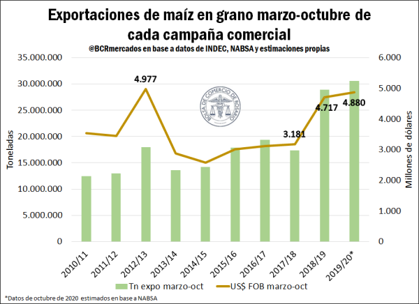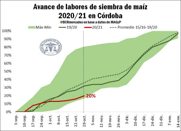 Al mismo tiempo, la provincia Córdoba se ha consolidado como la jurisdicción que más área destina a maíz. Según el Ministerio de Agricultura, para la campaña 2020/21 se prevé una cobertura de 2,89 M ha aunque al 29 de octubre apenas se ha avanzado sobre el 20% de dicha superficie, muy por debajo del 32% alcanzado a la misma altura del año anterior. En este sentido, se encuentra muy próximo a los mínimos históricos y por detrás del 36% promedio de las últimas cinco campañas. Si bien en la última semana se registraron lluvias que permitieron implantar algunos lotes más del cereal temprano, resta una importante superficie por sembrar que posiblemente avance con mayor ímpetu a partir de diciembre tras la ralentización habitual de labores durante el mes de noviembre.