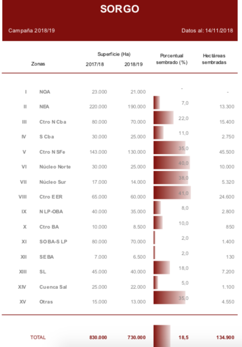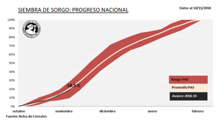 Durante las últimas semanas comenzaron las incorporaciones tempranas de sorgo granífero en el centro y norte del área agrícola nacional. Gran parte de la superficie sembrada se ubica en las provincias de Córdoba, Buenos Aires, Entre Ríos y Santa Fe. Los lotes más adelantados se encuentran diferenciando hojas, en algunos casos bajo condición de excesos hídricos debido a las lluvias de las últimas semanas, que a su vez podrían generar algunas perdidas de área. A la fecha el avance de siembra se ubica en 18,5 % de las 730.000 Ha. proyectadas para la campaña en curso, un 12 % inferior al ciclo previo. El avance quincenal fue de 10,5 puntos porcentuales; en números absolutos ya se han incorporado cerca de 135.000 Ha.