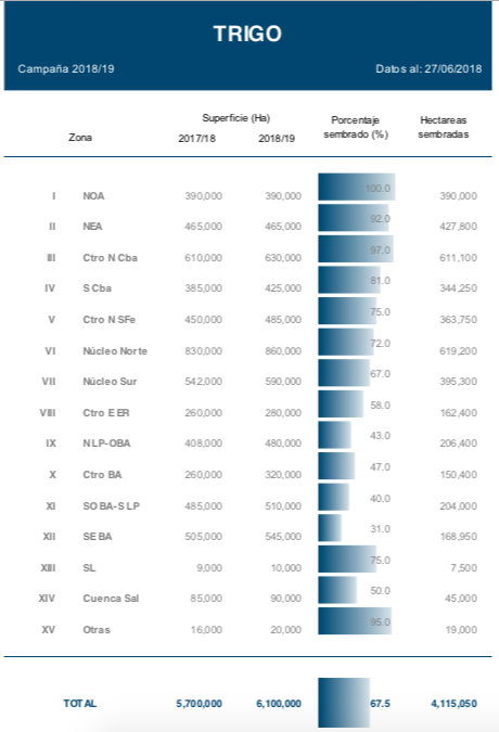 Continúa avanzando la siembra de trigo en todo el país, impulsada por las buenas reservas hídricas presentes en el centro y sur del área agrícola nacional. Además, la cosecha de soja se encuentra próxima a finalizar, liberando una mayor cantidad de lotes que ya se encuentran disponibles para la siembra del cereal. El avance intersemanal superó los 18 puntos porcentuales y permitió elevar el progreso nacional de siembra al 67,5 % de las 6.100.000 hectáreas proyectadas para la campaña 2018/19.