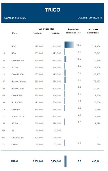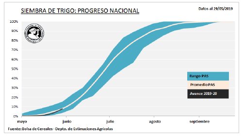 Al día de la fecha la siembra de trigo alcanzó el 7,7 % de las 6.400.000 ha proyectadas para la campaña 2019-20, con un avance de 13 puntos porcentuales en el NOA y un atraso de -7,8 puntos en el NEA.