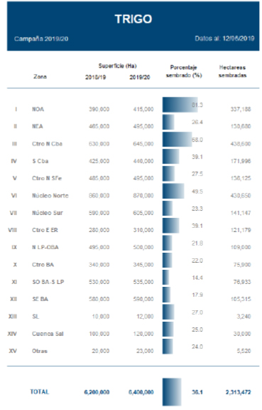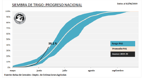La siembra de trigo superó en esta semana las 2,3 MHa, un 36,1% del área proyectada para la campaña 2019-20. Los mayores progresos se concentran en la región CentroEste de Entre Ríos y Centro Norte de Córdoba.