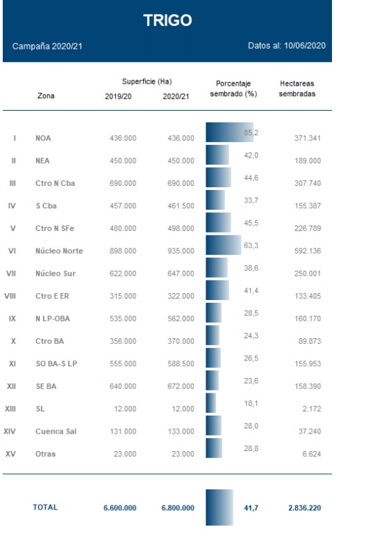 La siembra ya cubre el 41,7 % de las 6,8 MHa proyectadas para el ciclo en curso. El progreso intersemanal fue de 11,7 puntos porcentuales. A la fecha se registra un adelanto interanual de 5,6 puntos.