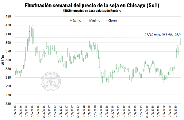 Luego de haber tocado un mínimo relativo a mediados de marzo, el contrato de soja con mayor volumen de Chicago trepó hasta tocar los US$ 400/t durante la sesión del martes, el valor más alto desde julio de 2016. Entre los principales determinantes de esta suba se encuentran la disipación de parte de la incertidumbre que resultó de la primera oleada de la pandemia de COVID-19, el fuerte impulso de las compras por parte de China (primero a Brasil y luego a EEUU) y, ya en las últimas jornadas, las dudas en cuanto a la producción brasileña a causa de la sequía y la considerable reducción de stocks del país vecino.