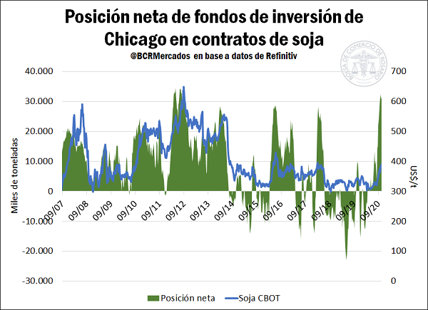 Dentro del informe de Commitments of Traders (COT) del martes último, se relevó que el posicionamiento de los fondos había alcanzado el 20 de octubre un equivalente a 31,5 Mt compradas. Si bien el máximo del año se dio el 06 de octubre con 32,4 Mt, el volumen actual no dista mucho de ese registro.