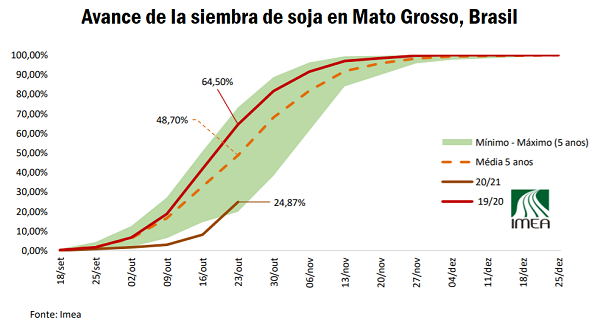 Siguiendo los datos de IMEA, la implantación de la oleaginosa en Mato Grosso ha mejorado el mínimo registro para la semana pasada pero aún la separan 24 p.p. del avance promedio de 5 años y 39 p.p. de la marce del año pasado.
