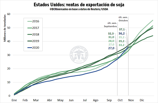 Un mes atrás, en el cierre de septiembre, los exportadores de Estados Unidos llevaban vendidas 27,0 Mt de poroto de soja, 5 Mt menos que en igual fecha de 2019,4 Mt menos que en 2018 y también por debajo de las marcas de 2017 y 2016. Sin embargo, en el último mes las declaraciones de ventas externas crecieron un 34%, logrando el mayor crecimiento porcentual para el período en las campañas consideradas. Con tal despegue, las ventas superaron los registros de los años anteriores, quedando detrás sólo del total del año pasado. Ciertamente, el volumen actual vendido de 36,2 Mt de soja aporta optimismo en el cierre de la cosecha estadounidense 2020/21.