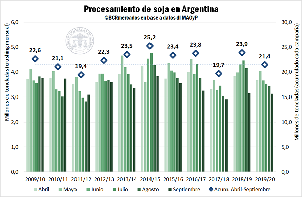 Durante el mes de septiembre, la industria oleaginosa argentina procesó 3,1 millones de toneladas de soja según datos del Ministerio de Agricultura, Ganadería y Pesca (MAGyP). Así, el crushing del sexto mes de la campaña que inició en abril, se convirtió en el menor volumen mensual para el ciclo 2019/20. Como es normal, la actividad industrial del complejo soja suele tener su estacional pico en el mes de mayo, procesando más de 4,0 Mt y a partir de allí el volumen de poroto industrializado decrece mes a mes en consistencia con el patrón estacional. Cabe destacar que todos los totales mensuales de procesamiento registrados estuvieron por debajo de los promedios de las últimas 10 campañas.
