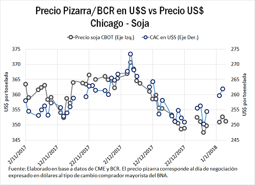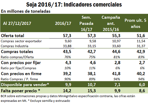 A pesar de que existen al 27 de diciembre aproximadamente 10 millones de toneladas de soja de la cosecha 16/17 sin vender (17 % de la producción), la misma no se vuelca masivamente al mercado, por lo que al existir una demanda sostenida por parte de las fabricas para abastecerse de stocks, el precio en pesos por la oleaginosa argentina se encuentra firme.