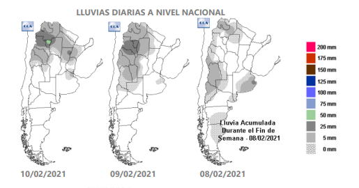 Las próximas lluvias serán claves para completar un buen llenado de granos en soja temprana. Los pronósticos auguran tormentas de manera aislada, con eventos puntuales y erráticos para el fin de semana, por lo tanto no toda el área núcleo será beneficiada de manera generalizada por este evento. Los técnicos indican que se necesitaría un evento con acumulados de 20 a 90 mm con gradiente creciente de norte a sur, necesidad que no espera cubrirse en el próximo evento.