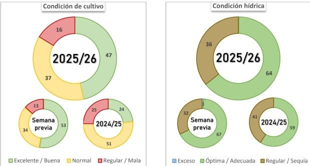 En línea con esto, la condición hídrica Adecuada a Óptima alcanza al 64% del área, tras retroceder 2,6 puntos porcentuales en la última semana. La falta de nuevas precipitaciones comienza a marcar diferencias entre zonas.