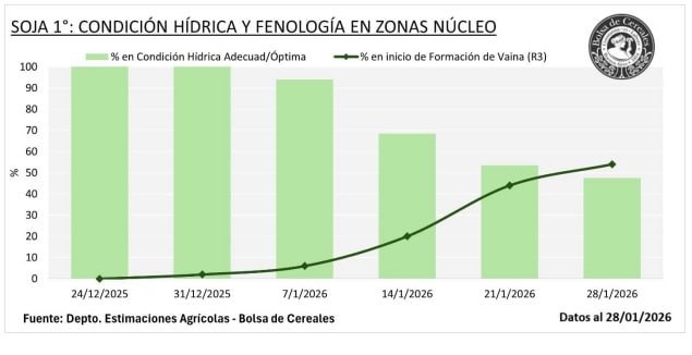 Uno de los datos más relevantes del informe es que el 30% de la soja de primera ya inició su período crítico, especialmente en los núcleos productivos, donde el cultivo define gran parte del rendimiento. En estas regiones, las lluvias de las próximas semanas serán determinantes para sostener el potencial productivo.