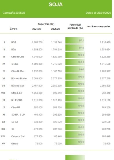 La campaña de soja 2025/26 transita una etapa clave. La siembra está prácticamente finalizada, con un avance del 99,5% del área prevista, y solo resta completar labores en sectores del norte del área agrícola. Con el cultivo ya en pie, el foco del mercado y de los técnicos comienza a desplazarse hacia la evolución climática y su impacto sobre el rendimiento.
