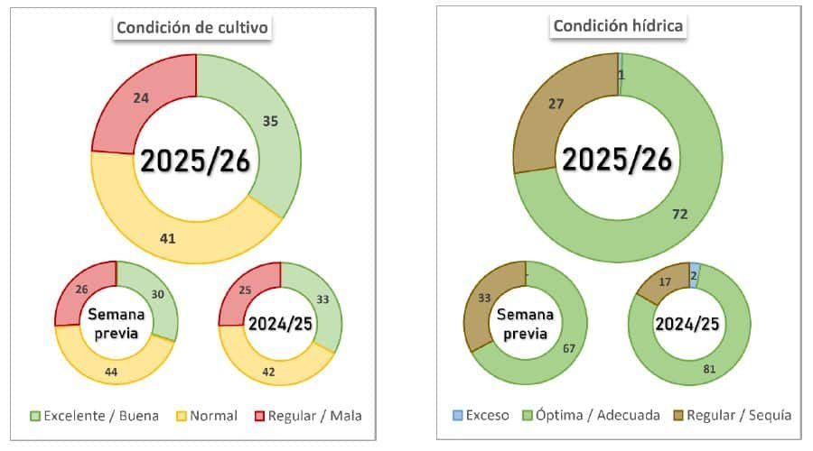 En este contexto, se mantiene la estimación de producción nacional en 48,5 millones de toneladas, impulsada por la mejora en la condición del cultivo tras las últimas lluvias.