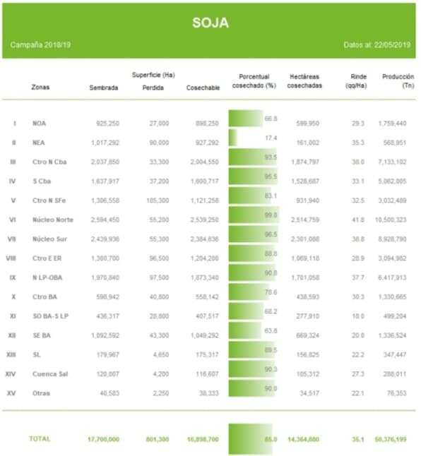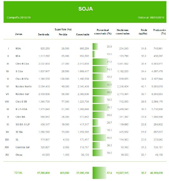 La cosecha avanzó 8,3 puntos porcentuales durante los últimos siete días, con gran actividad en la región bonaerense y en sectores del NOA. Los elevados rendimientos registrados sobre el centro de la región agrícola, compensan parcialmente las pérdidas de área y rinde en gran parte del NEA y sectores del extremo norte santafesino, permitiendo sostener la proyección de producción en 56 millones de toneladas.