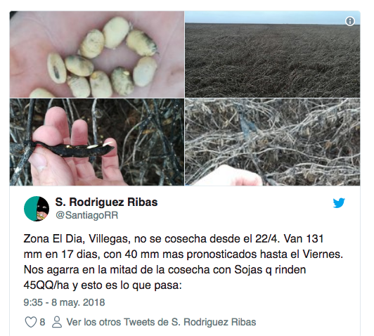 En rigor, se esperan más precipitaciones para los próximos días. Hay zonas con casi 20 días donde la recolección está frenada. Desde la zona de El Día, en General Villegas, Santiago Rodríguez Ribas comentó que por las lluvias no pueden cosechar desde el 22 de abril pasado. “Van 131 mm en 17 días, con 40 mm más pronosticados hasta el viernes”, escribió en su cuenta de Twitter.