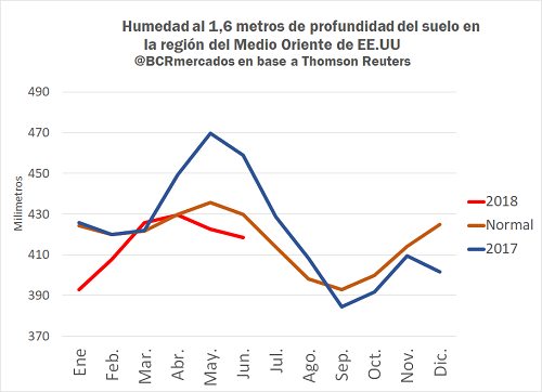 El Departamento de Agricultura de Estados Unidos (USDA, por sus siglas en inglés) en su último informe semanal de seguimiento de cultivos calificó la condición del maíz por debajo de lo esperado en el mercado. El maíz está atravesando el periodo crítico de floración con reservas menores a la media de los últimos 5 años y muy inferiores respecto de la campaña pasada, tal como muestra el siguiente gráfico: