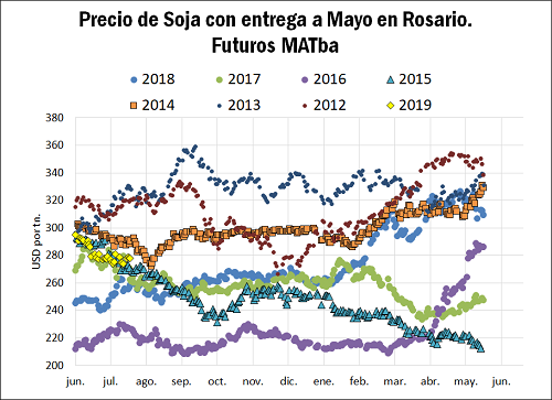 En principio, los precios resultan atractivos para apostar a la oleaginosa ya que los futuros a mayo 2019 con entrega en Rosario negociados en MATba se encuentran en niveles promedio de los últimos cinco años: por debajo de los máximos del 2012 y 2013, pero arriba de los niveles observados a la misma altura del año para las tres últimas campañas.