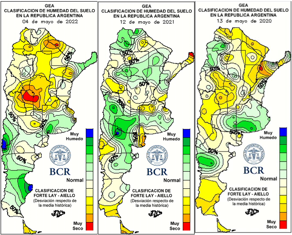 Dónde más se nota la diferencia es en Córdoba que arranca la siembra de trigo con toda la provincia en niveles de seco y muy seco. Allí, las condiciones son incluso peor que en el 2020, año de desastre para el trigo cordobés: la media provincial fue de tan solo 15 qq/ha. Puede suceder que la campaña tome el rumbo del 2021 y haya eventos de lluvias que mejoren el escenario y, por ende, la intención de siembra. Pero con falta de pronósticos de lluvias hasta el 20 de mayo, las actuales condiciones de Niña y la posibilidad de tener un tercer evento no puede descartarse el derrotero que tomó el trigo en el 2020. La primera estimación de intención de siembra de trigo refleja que el productor no quiere dejar de hacer trigo pero que hay limitaciones: la primera es climática y le siguen los problemas de los altos costos y, por consiguiente, la menor fertilización que se plantea hacer. El área sembrada estimada para el nuevo ciclo es de 6,35 millones ha, 550.000 ha menos que el año pasado, lo que resulta en una disminución interanual del 8%. De esta manera quedaría inmediatamente por debajo de la siembra del 2018/19 (6,47 M ha). Si el clima no se pone en contra del cultivo, la cosecha podría alcanzar los 19 Mt. El volumen estimado sale de tener en cuenta pérdidas de área en torno a 200.000 ha y un rinde promedio nacional de los penúltimos 5 años de 31 qq/ha.