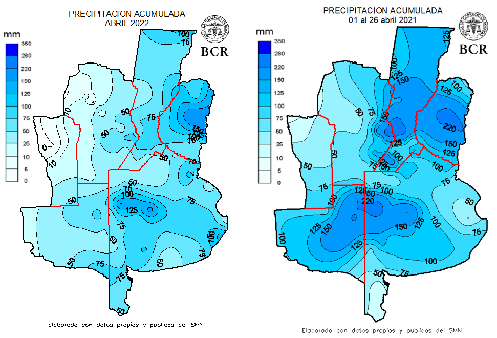 Respecto del escenario de siembra del año pasado, hay diferencias muy importantes, como señala la imagen de la anomalía de las reservas de suelo para Argentina: el centro, sur y sobre todo en el oeste de Buenos Aires y Entre Ríos arrancan mejor que hace un año. Pero en el resto de Argentina, las condiciones para el trigo en el primer metro del perfil son notoriamente inferiores. El porqué de esto está en abril del año pasado que dejó lluvias muy importantes. Algunos recordarán el bombazo de agua que hubo entre Santa Fe y Córdoba, con acumulados de más de 250 mm: 230 mm en Marcos Juárez, 260 mm en Montes de Oca. Comparando los acumulados mensuales de abril 2021 vs los de 2022 hay diferencias en la región pampeana que van de 50 a 150 mm.